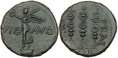Commemorates the battle of Philippi, 42 B.C., in which Octavian and Antony defeated the Republican tyrannicides Brutus and Cassius, who subsequently committed suicide. Augustus later settled the veterans of a Praetorian Cohort at Philippi, and he conferred upon them the right to mint coins, of which this is an example. The images on this coin presumably refer to the Emperor’s above described victory in 42 BC. The winged victory standing on a globe representing the cosmos. Such a coin is delivering, without words but in clear images that everyone would have understood, the message that Augustus now rules the world. All the old political institutions were reestablished and the “dignity” of the Senate was restored, but actual power was now in the hands of one man alone.